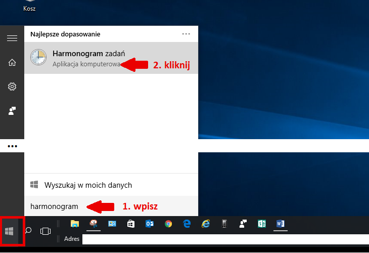 W tym celu kliknij menu Start i zacznij wpisywać słowo harmonogram. Komputer sam znajdzie aplikację. Kliknij jej nazwę.