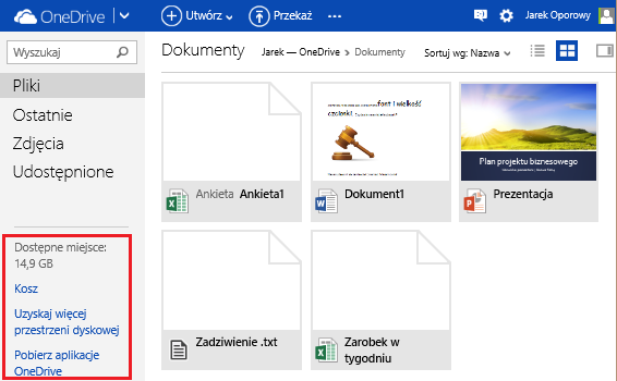 W poprzednim etapie tworzyliśmy dokumenty różnego typu, korzystając z menu Utwórz paska OneDrive. Okno z zawartością folderu Dokumenty OneDrive wyglądało jak poniżej: