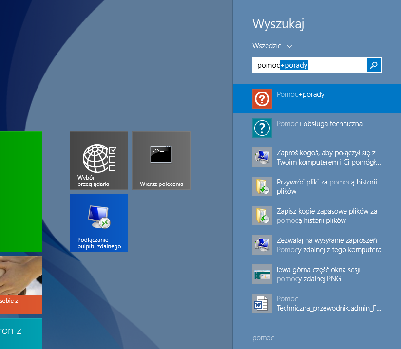W Windows 8.1 również zaczniemy od wpisania w polu wyszukiwania hasła Pomoc . Pole wyszukiwania w Windows 8.1 znajduje się na ekranie startowym. Po przejściu do ekranu startowego wystarczy zacząć pisać. W wynikach wyszukiwania pojawi się opcja Zaproś kogoś, aby połączył się z Twoim komputerem i Ci pomógł… .