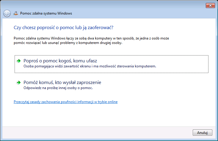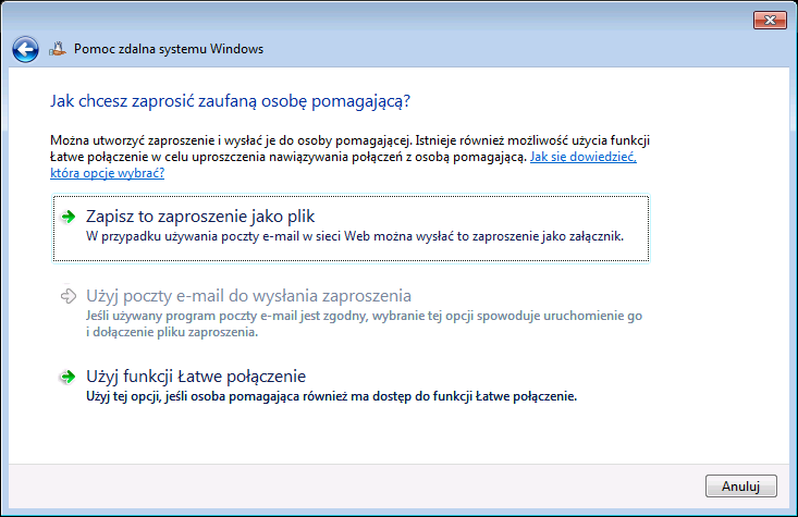Postępujemy zgodnie z instrukcją wyświetlającą się w oknie. Klikamy opcję: Poproś o pomoc kogoś, komu ufasz. Pokaże się nam kolejne okno z opcjami określającymi sposób zaproszenia osoby pomagającej.