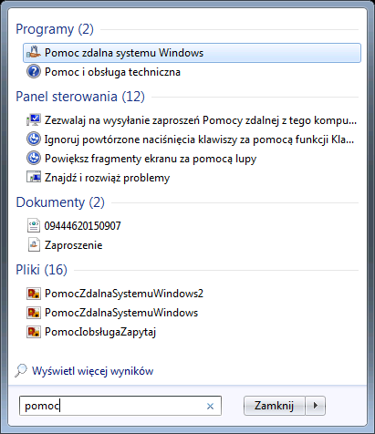 Konfigurowanie pomocy zdalnej w Windows 7 możemy zacząć bardzo podobnie jak w Windows 10 . Zacznijmy od wpisania w pole wyszukiwania (po naciśnięciu klawisza START) słowa pomoc. W wynikach wyszukiwania w sekcji Programy pojawi się aplikacja Pomoc zdalna systemu Windows.