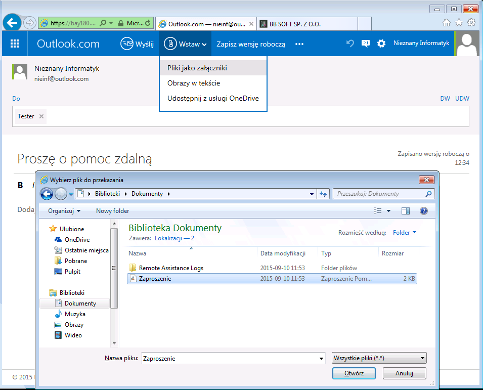Wpisujemy nazwę swojego konta Microsoft i hasło i za chwilę możemy adresować nową pocztę do naszego eksperta z prośbą o pomoc zdalną. Dołączamy plik zaproszenia z biblioteki Dokumenty i wysyłamy e-mail z zaproszeniem.