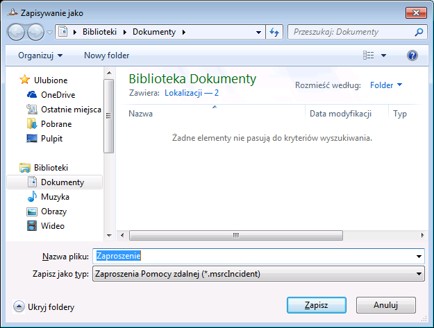 Jeżeli na tym komputerze nie ma skonfigurowanej poczty elektronicznej, to opcja użycia aplikacji poczty e-mail jest wyszarzona. Oczywiście możemy zapisać plik zaproszenia na dysku, a potem wysłać go do zaufanego eksperta za pomocą poczty uruchomionej na przykład w przeglądarce internetowej. Klikamy więc opcję: Zapisz to zaproszenie jako plik. Otworzy się nam okno zapisywania pliku zaproszenia na dysku — domyślnie w bibliotece Dokumenty.