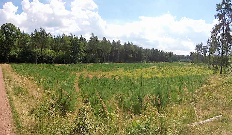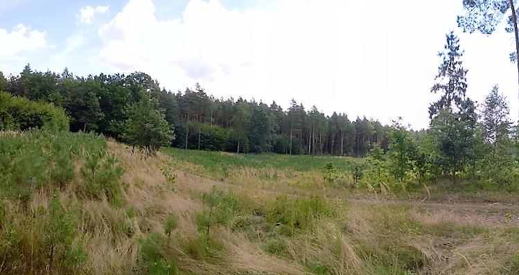 W pewnym momencie dochodzimy do wzgórka, od którego zaczyna się spora poręba. Robię dwie panoramy. Pierwsza w pełni udana — cztery ujęcia i rozdzielczość sumarycznego zdjęcia 6244 x 3316. Druga panorama skończyła się na trzech ujęciach 6009 x 3502. Poniżej w wersji szerokości 800 pixeli.