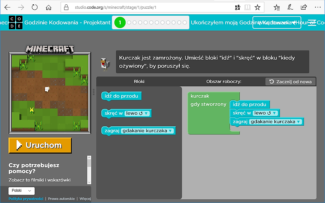 Godzina kodowania w tygodniu próby to powtórka tego, co było w zeszłym roku. Trochę problemów znowu było z wybieraniem ćwiczeń, zbyt szybkim przeskakiwaniem do najtrudniejszych zadań no i zbaczaniem z tematu (albo w bok, albo na manowce). Po powtórkach wybraliśmy programowanie w Minecraft. I to znowu był powrót, tym razem w komputerze, do programowania owcami, krówkami i innymi obiektami. Zadania dla dziecka niebanalne, można powiedzieć że trudne, ale satysfakcja jeszcze większa.