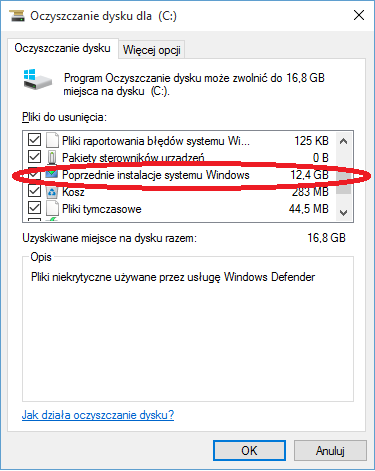 W pierwszym wpisie po premierze Windows 10 opisałem jak łatwo poszło z aktualizacją bardzo słabego tabletu (1 GB RAM / 16 GB na dysku flash). Jednak nie opisałem jeszcze jednej bardzo istotnej kwestii. Dopiero wczoraj wróciłem jak administratorowi przystało do przejrzenia stanu komputera. W panelu „Oczyszczanie dysku” znalazłem taką oto pozycję jak niżej w zaznaczeniu na rysunku: